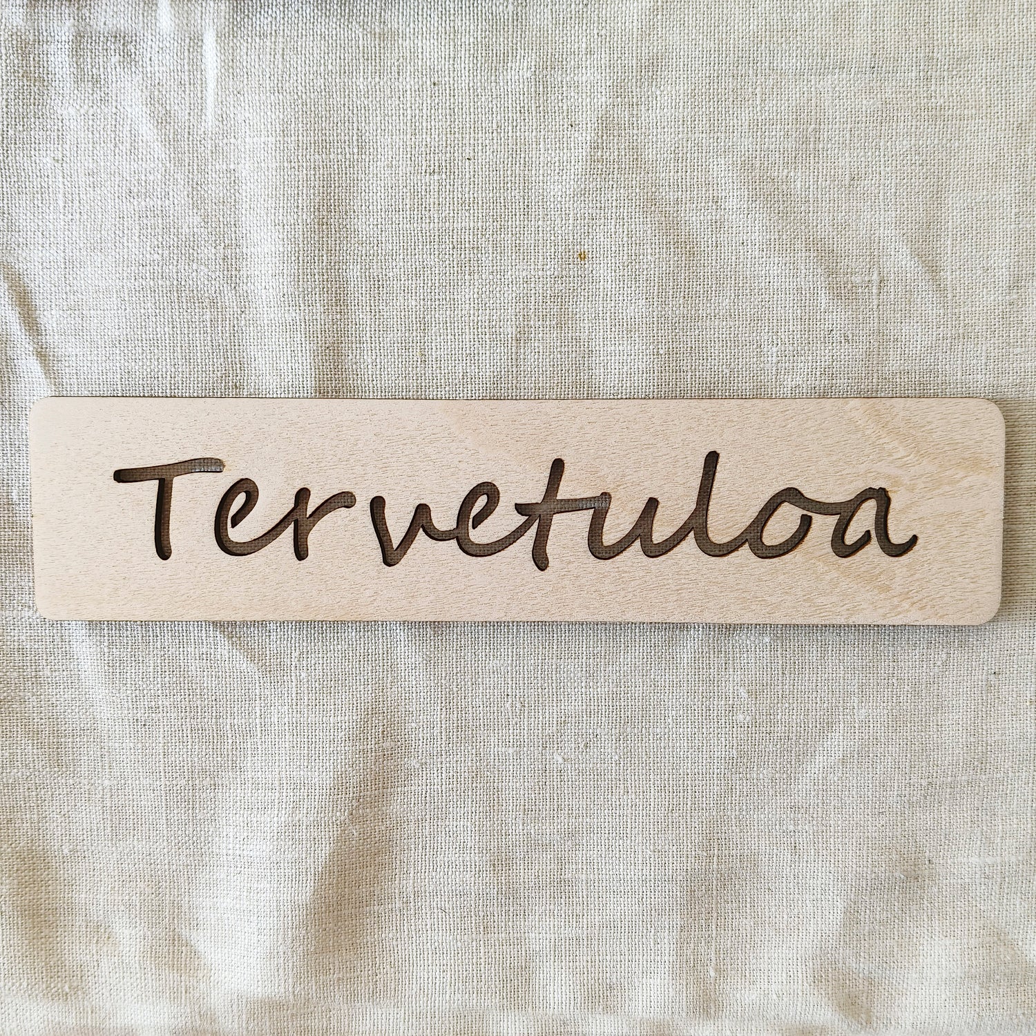 Toivota vieraat tervetulleeksi tällä tyylikkäällä kyltillä. Valmistettu käsittelemättömästä koivuvanerista, joten kestää parhaiten sisätiloissa. Ulkotiloihin asennettaessa suosittelemme homeenestokäsittelyä.