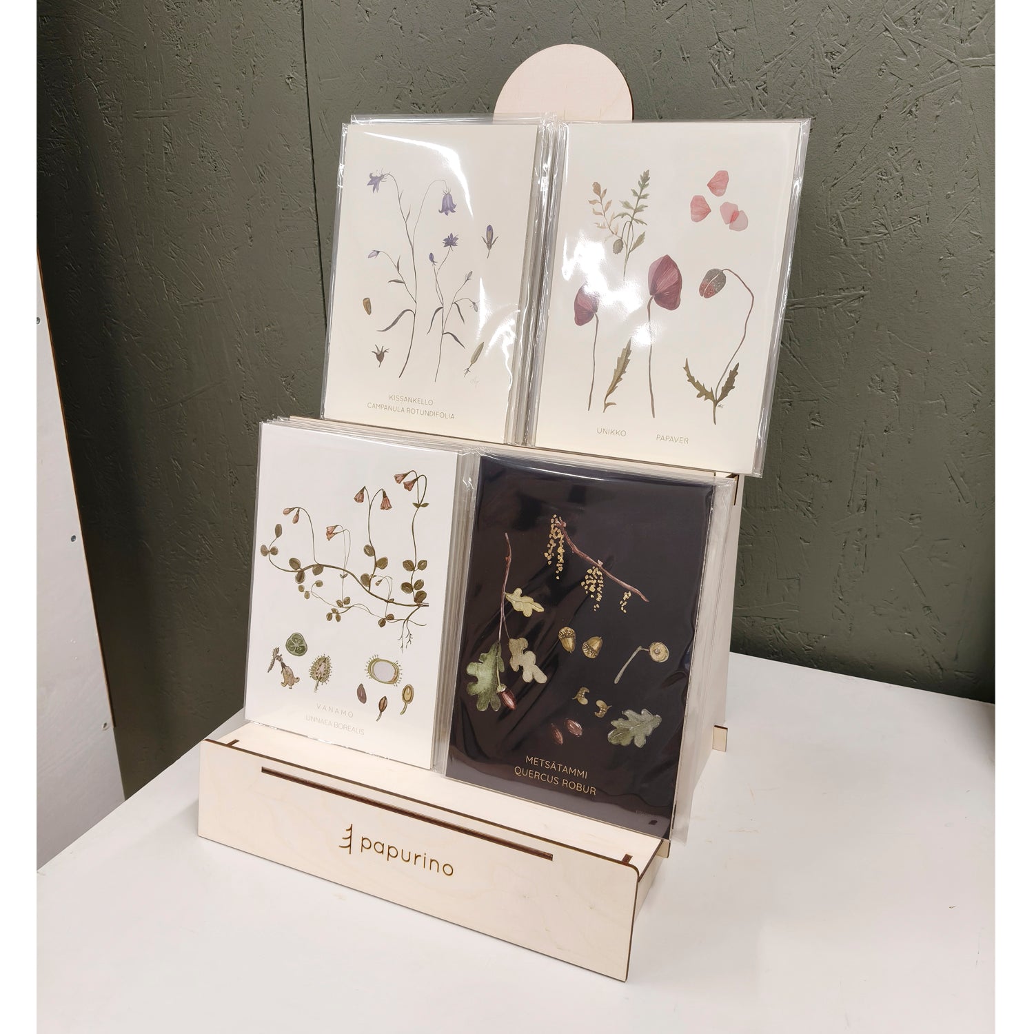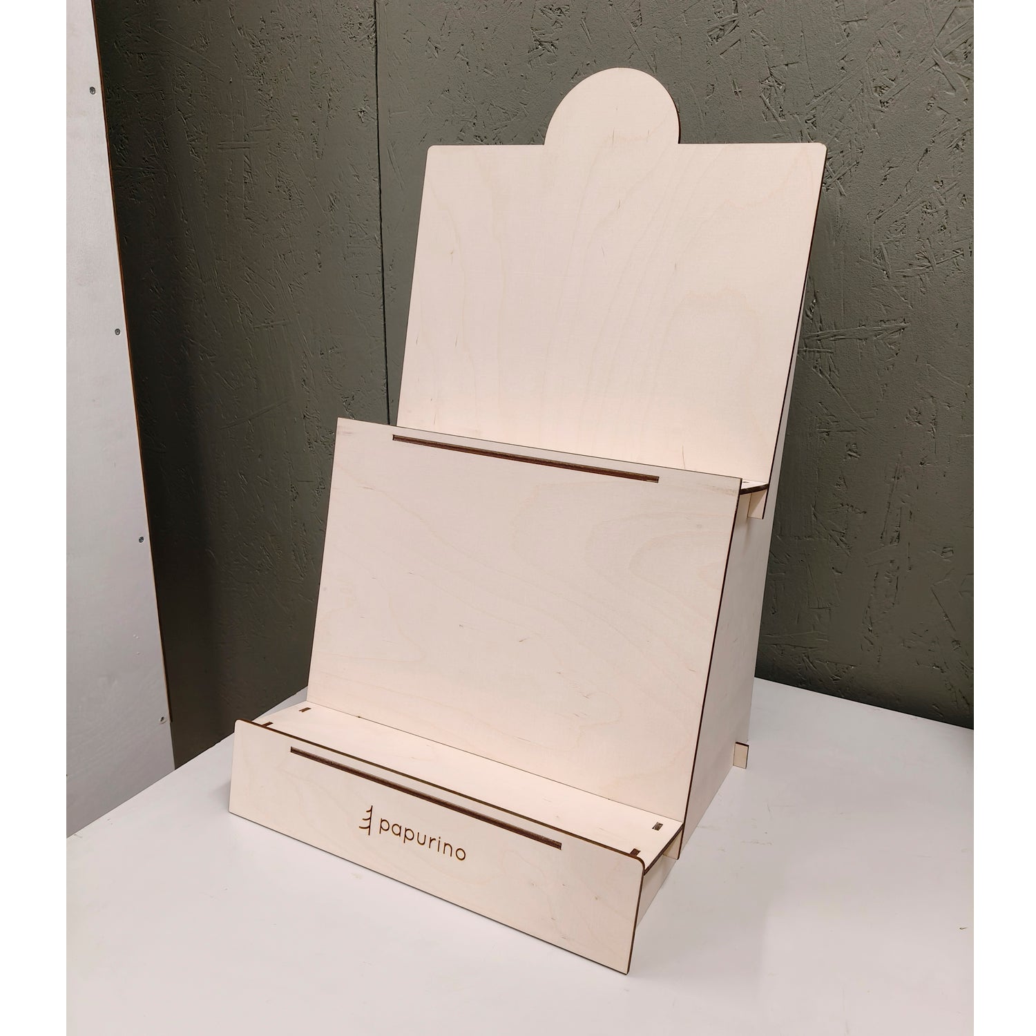 Plywood shelf for e.g. A5-sized prints. Width 30 cm, height 50 cm. If you wish, we can engrave your own logo on the bottom. Delivered in parts. The product is easy to assemble, all you need is a hammer and glue.