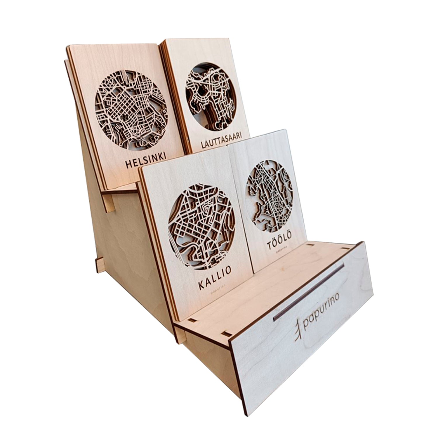 Plywood shelf for e.g. A6-sized cards. Width 22 cm, height 30 cm. If you wish, we can engrave your own logo on the bottom. Delivered in parts. The product is easy to assemble, all you need is a hammer and glue.
